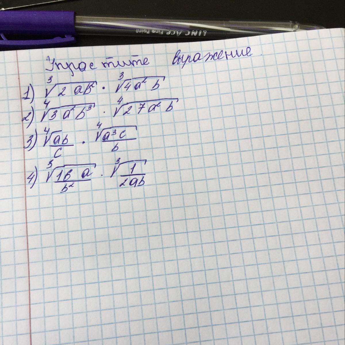 \sqrt[3]{2ab^2}\cdot \sqrt[3]{4a^2b}=\sqrt[3]{2ab^2\cdot 4a^2b}=\sqrt[3]{8a^3b^3}=2ab\\\\\\\sqrt[4]{3a^2b^3}\cdot \sqrt[4]{27a^2b}=\sqrt[4]{81a^4b^4}=3ab\\\\\\\sqrt[4]{\frac{qb}{c}}\cdot \sqrt[4]{\frac{a^3c}{b}}=\sqrt[4]{\frac{ab}{c}\cdot \frac{a^3c}{b}}=\sqrt[4]{a^4}=a\\\\\\\sqrt[3]{\frac{16a}{b^2}}\cdot \sqrt[3]{\frac{1}{2ab}}=\sqrt[3]{\frac{16a}{b^2\cdot 2ab}}=\sqrt[3]{\frac{8}{b^3}}=\frac{2}{b}