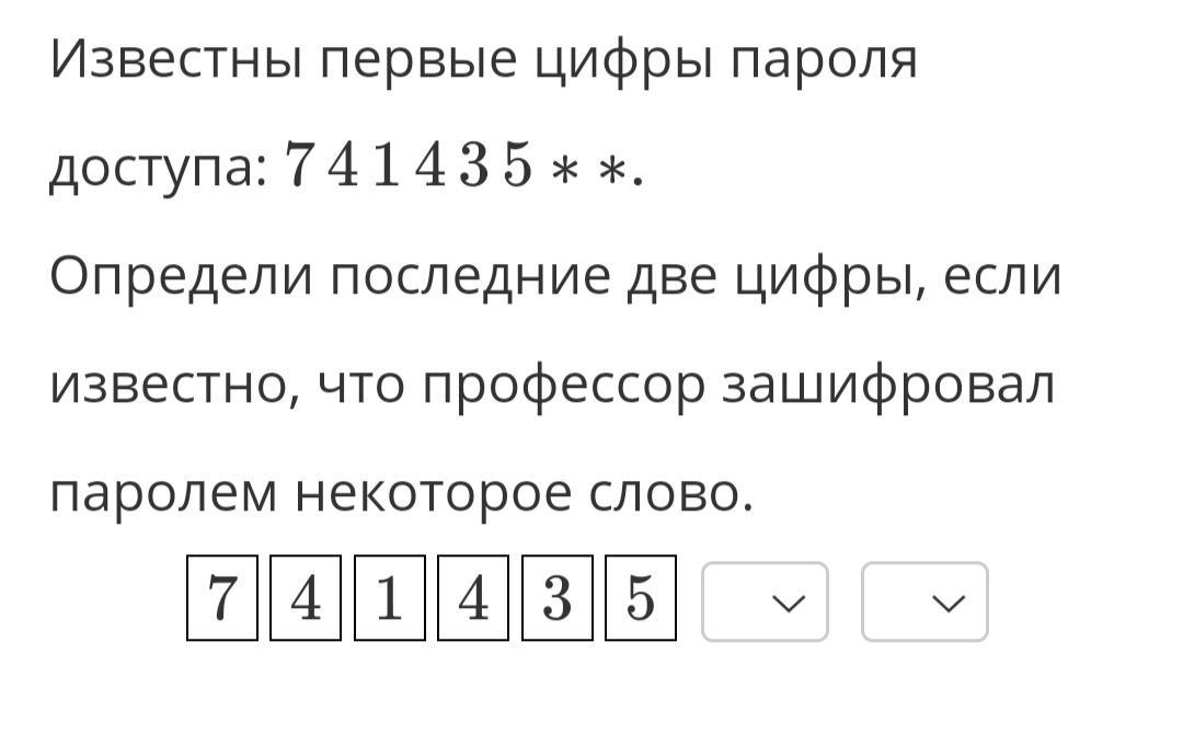 Известны первые цифры пароля доступа: 7\,4\,1\,4\,3\,5**.741435∗∗.