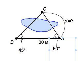 чтобы найти расстояние d от пункта а до недоступного пункта с на местности выбрали точку b и измерили длинну c отрезка ab и углы a и b найдите расстояние от пункта a до пункта c если ab равно 30 м a равно 60 градусов b равно 45 градусов