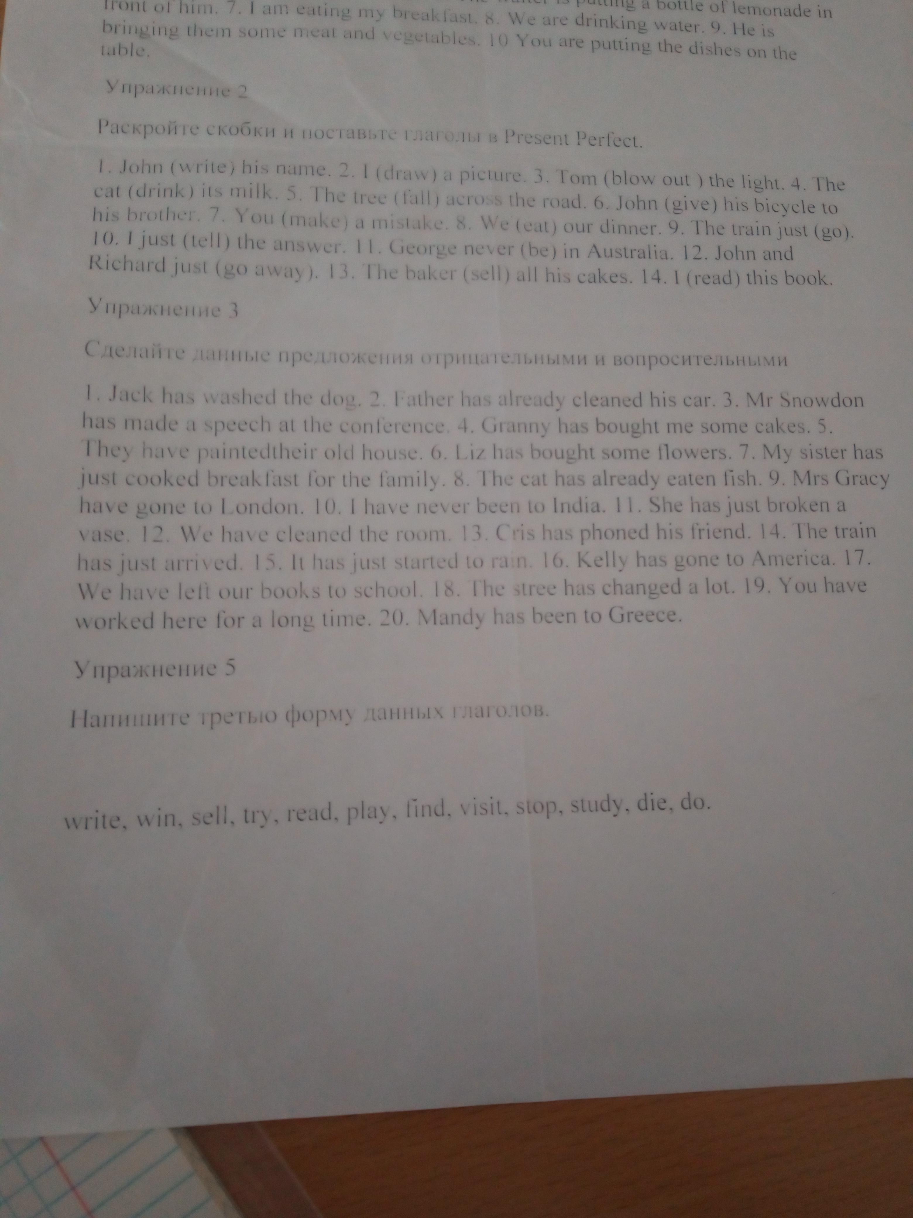 Упр 2 1.written. 2.driven. 4 drunk. 5. fallen. 6. given. 7. made. 8. eaten. 9. gone. 10. told. 11. been. 12. gone away 14. read. Упр 5 written, won, ?, ?, read, played, found, visited, ?, ?, ?, done. ( ?- не знаю)