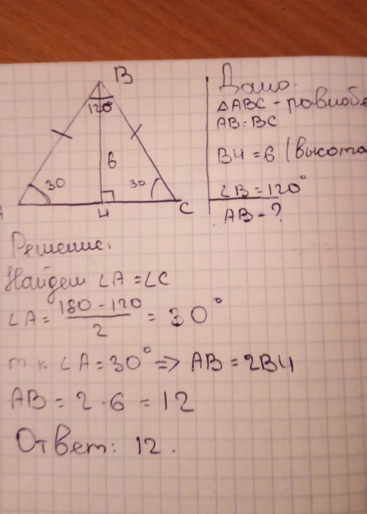 1) Найдите боковую сторону равнобедренного треугольника, высота которого равна 6 см, а угол при вершине равен 120;