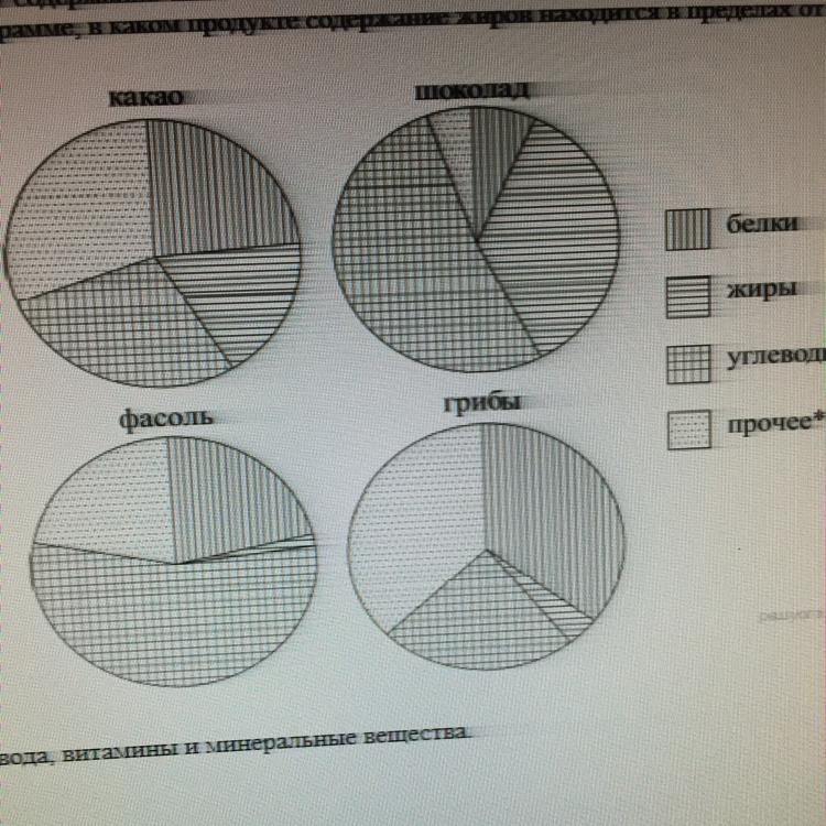 На диаграмме показано содержание питательных веществ в какао молочном шоколаде фасоли и сушеных белых грибах. Определите по диаграмме в каком продукте содержание жиров находится в пределах от 15% до 25