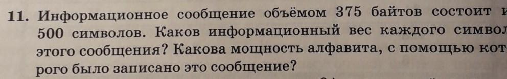 Информационное сообщение объёмом 375 байтов состоит из 500 символов. Каков информационный вес каждого символа этого сообщения? Какова мощность алфавита, с помощью которого было записано это сообщение?