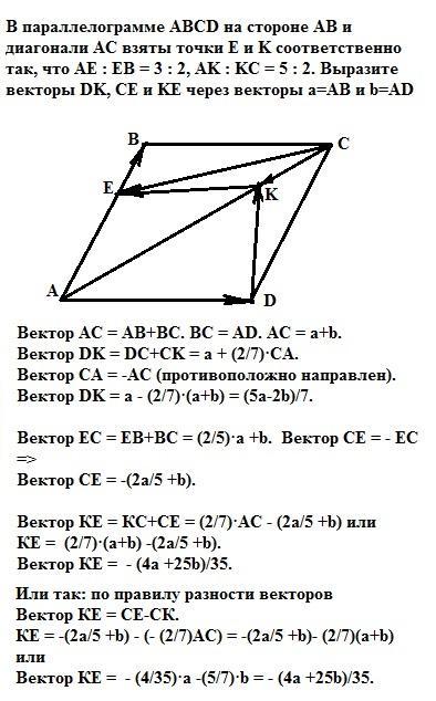 В параллелограмме ABCD на стороне AB и диагонали AC взяты точки E и K соответственно так, что AE : EB = 3 : 2, AK : KC = 5 : 2. Выразите векторы DK, CE и KE через векторы a=AB и b=AD