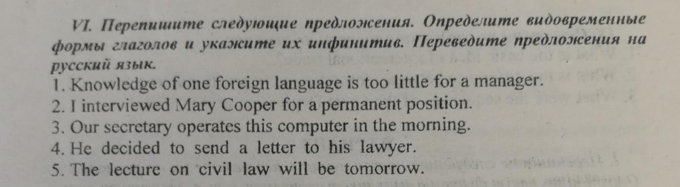 VI. Перепишите следующие предложения. Определите видо-временные формы глаголов и укажите их инфинитив. Переведите предложения на русский язык.