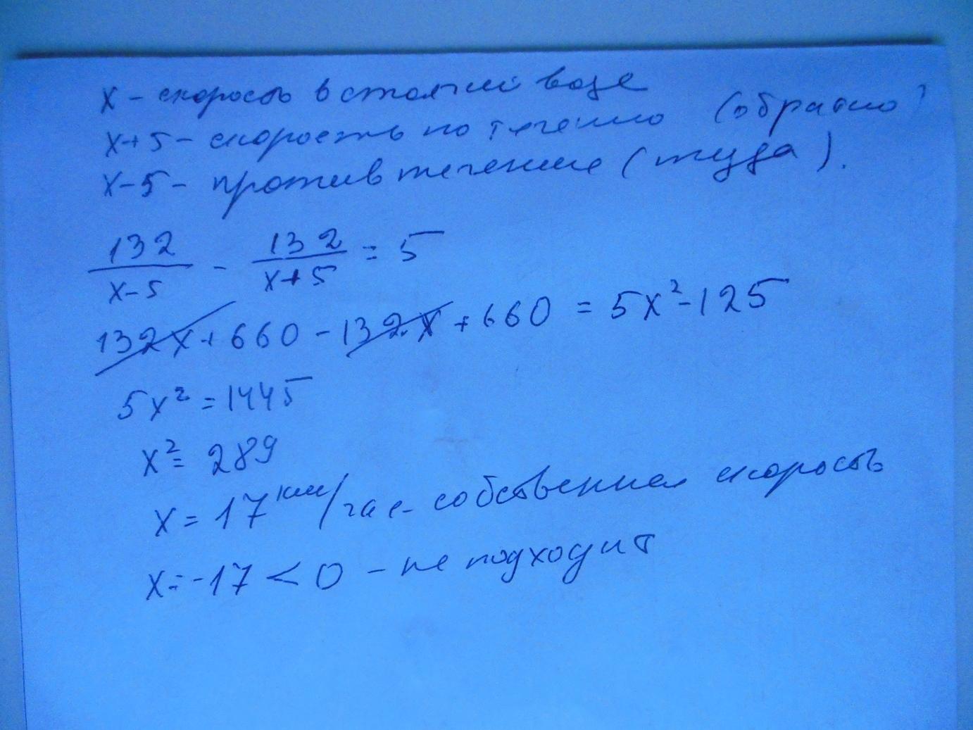 Катер плыл сначала против течения реки 132 км, а потом вернулся назад, потратив на обратный путь на 5 часов меньше. Найдите скорость катера в стоячей воде, если скорость течения составляет 5 км/ч.