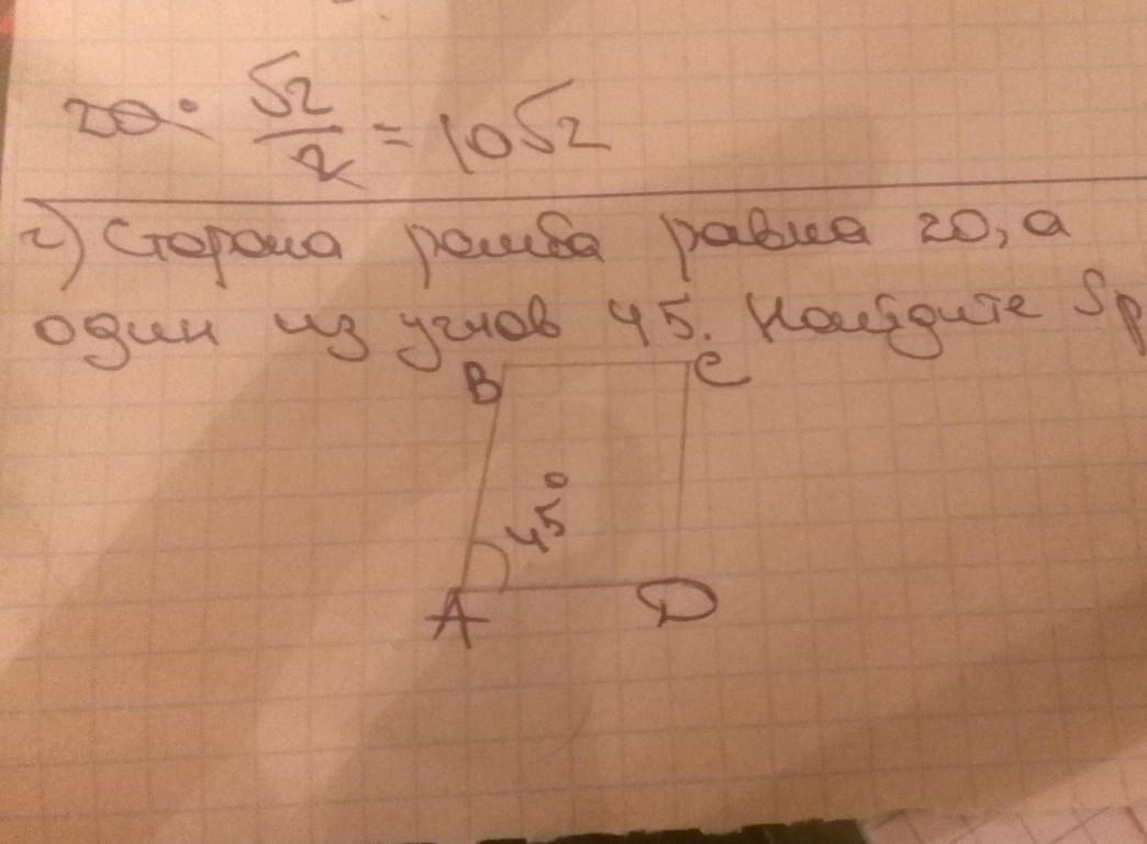 площадь ромба равна длина стороны в квадрате умножить на синус угла.