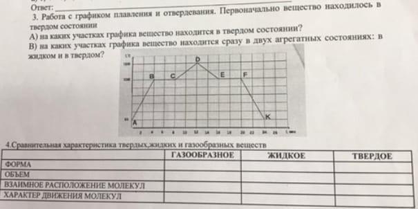 По графику видно,что вещество преобладает в различных формах.Изначальная температура 55°С. При её повышении(отрезок АВ),вещество нагревается ,но не переходит в другую форму!После чего,оказавшись на температуре в 1085°С,вещество будет переходить из твёрдого в жидкое(плавление)(отрезок BC). Выше будет уже кипение. Нас не интересуют отрезки CD,DE. Во время отрезка EF мы видим процесс кристаллизации(из жидкого в твёрдое). В это время,так же,как и на отрезке BC,вещества переходят из жидкое в твёрдое или наоборот,на этих отрезках мы видим,что там и там и жидкое,и твёрдое. После чего,вещество охлаждается (отрезок FK),и график кончается.Изменений не произошло, в отрезке,а значит на отрезке твёрдое вещество,как и на отрезке AB. Газы форму не имеют,но заполняют объём,максимально доступный,условно у них тоже есть объём,но он нефиксированный. Так как,заполняют то,что ограничивает. Они находятся на большом расстоянии друг от друга,и двигаются с огромной скоростью и хаотично. Жидкости не имеют постоянную форму,но могут принять форму того,во что вливаются.В следствии,чего и объём тоже есть при определённых обстоятельствах. Твёрдые вещества сохраняют форму и объём.Молекулы расположены плотно и не могут удаляться.