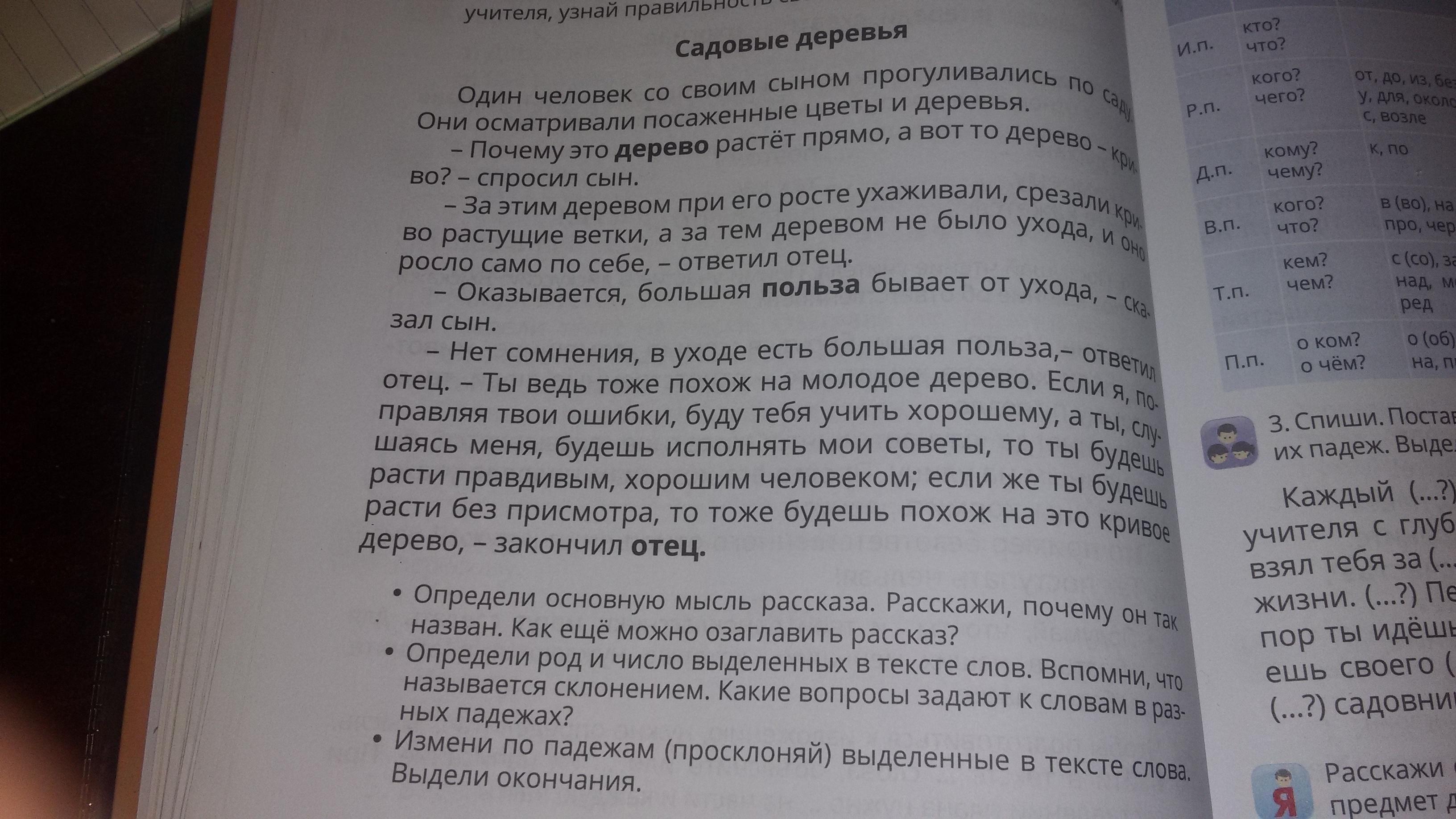 Определи основную мысль рассказа.Расскажи почему он так назван как еще можно озагловить рассказ? Определи род и число выделенных в тексте слов. Вспомни, что называются склонение. Какие вопросы задают к словам в разных подежах? Выдели по поджав (просклоняй) выделенные в тексте слова. Выдели окончание