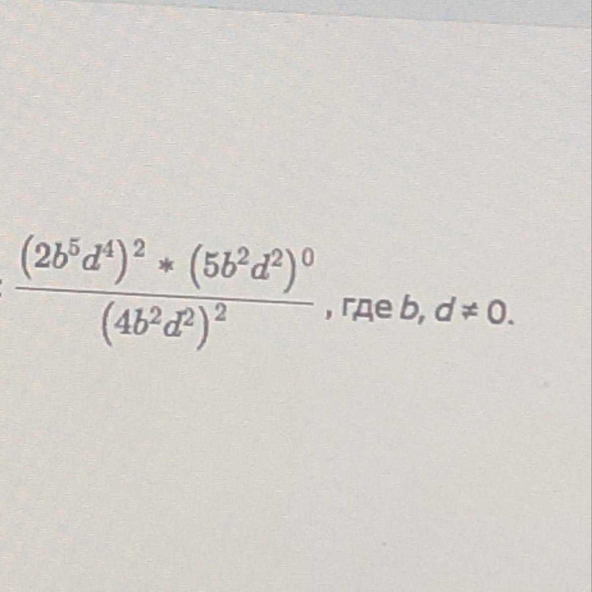 \tt\displaystyle \[\frac{{{{(2{b^5}{d^4})}^2}*{{(5{b^2}{d^2})}^0}}}{{{{(4{b^2}{d^2})}^2}}} = \frac{{4{b^{5*2}}{d^{4*2}}*{5^0}{b^{2*0}}{d^{2*0}}}}{{16{b^{2*2}}{d^{2*2}}}} = \frac{{4{b^{10}}{d^8}*1*1*1}}{{16{b^4}{d^4}}} = \frac{1}{4}{b^{10 - 4}}{d^{8 - 4}} = \frac{{{b^6}{d^4}}}{4}\]