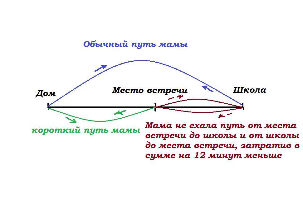 ПОМОГИТЕ!!! СЛОЖНАЯ ЗАДАЧА!!!У Маши в школе уроки заканчиваются в 13:00, мама встречает её на машине, и они едут домой. Однажды уроки закончились в 12:00, и Маша пошла домой пешком. По пути она встретила маму, которая, как обычно поехала забирать дочь к 13:00 в школу. И дальше Маша с мамой поехали домой на машине, причём приезали на 12 минут раньше обычного. Во сколько Маша встретила маму на дороге? (Скорости маши и мамы постоянны, время на посадку в машину не тратится.)