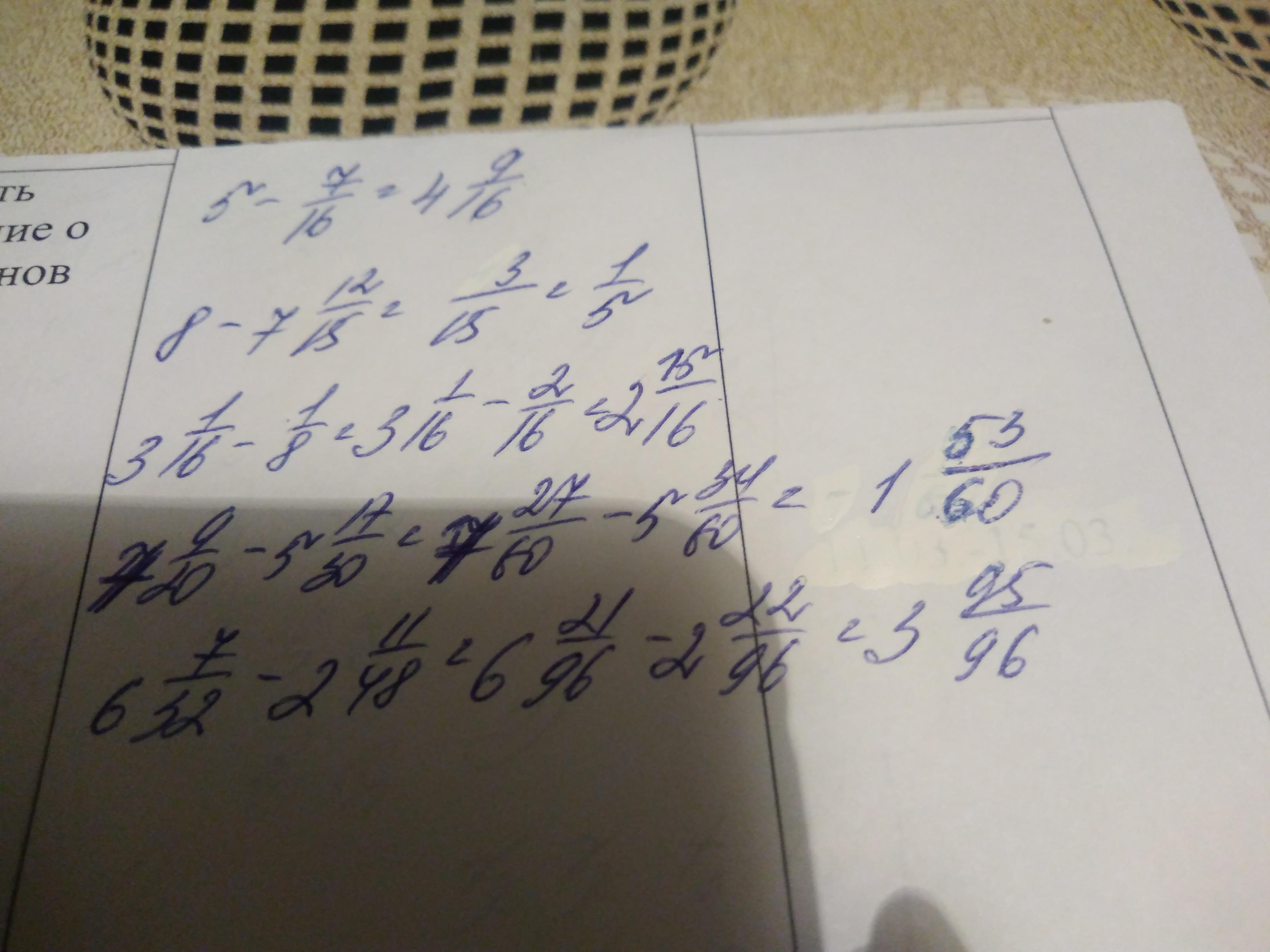 1) 5- 7/16. 2) 8 -7 12/25. 3) 3 1/16 - 1/8. 4) 7 9/20 - 5 17/30. 5) 6 7/32 - 2 11/48