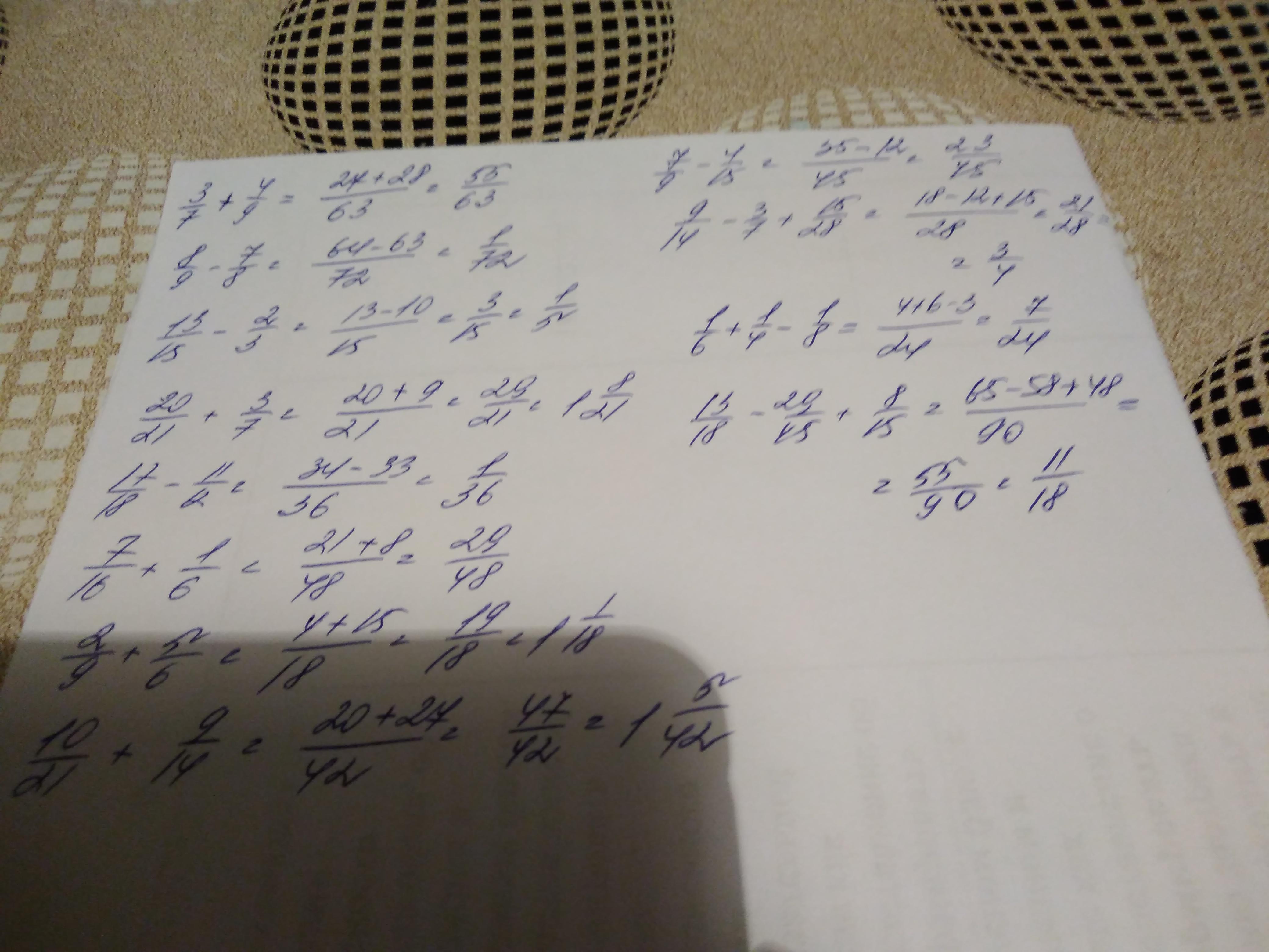 3/7 + 4/9, 8/9 - 7/8, 13/15 - 2/3, 20/21 + 3/7, 17/18 - 11/12, 7/16 + 1/6, 2/9 + 5/6, 10/21 + 9/14, 7/9 - 4/15, 9/14 -3/7 + 15/28, 1/6 + 1/4 - 1/8, 13/18 - 29/45 +8/15