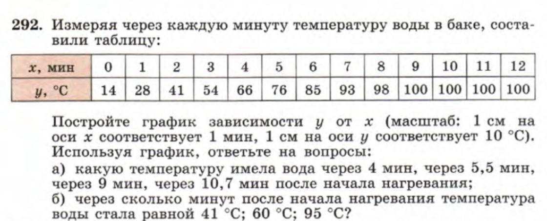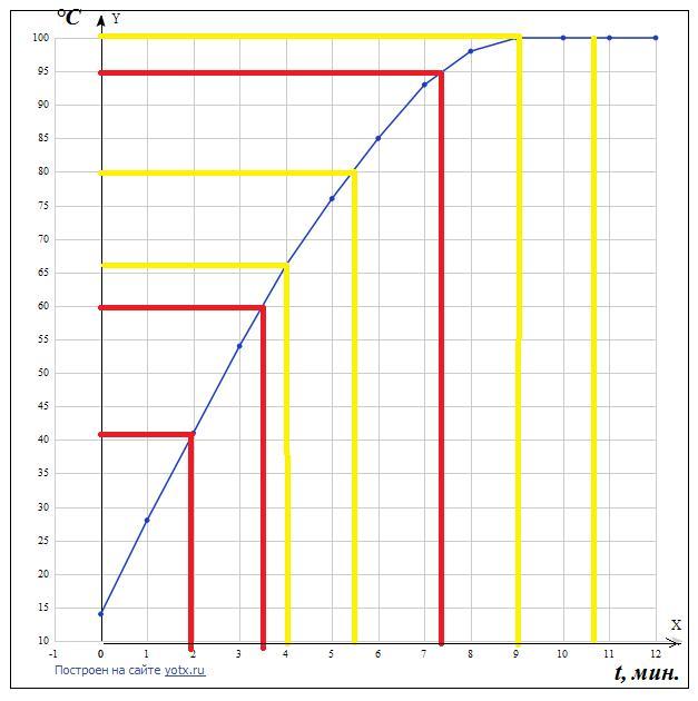 оси х соответствует 1 мин, 1 см на оси у соответствует 10 °С).