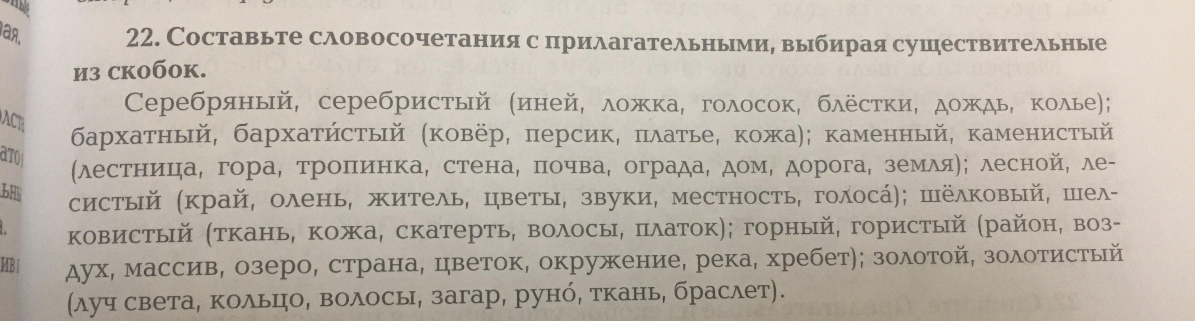 Серебряная ложка , серебристый иней , бархатное платье , бархатистый персик , каменная стена , каменистая почва , лесной житель , лесистый край , шёлковый платок , шелковистые волосы , горный воздух , гористый массив , золотое кольцо , золотистый загар .