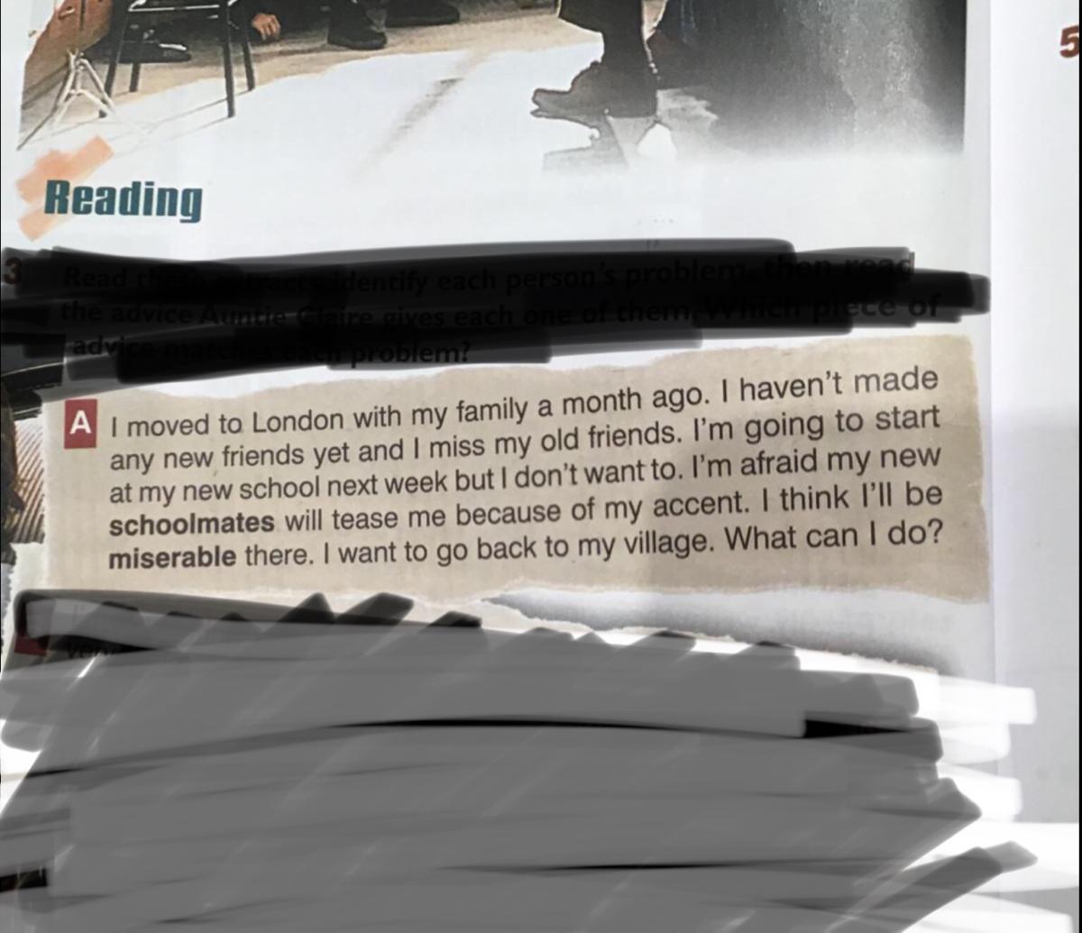 He said that he had moved to London with his family a moth ago. He hadn't made any new friends at that moment and he missed his old friends. He was going to start at his new school the following week but he didn't want to. He was afraid his new schoolmates would tease him because of his accent. He thinks he would be miserable there. He wanted to go back to his village. What could he do?