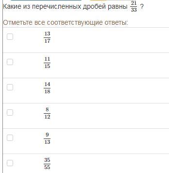 дробь 21/33 сократимая. и она равна 7/11, из перечисленных, если числитель и знаменатель умножим на 5, получим дробь 35/55