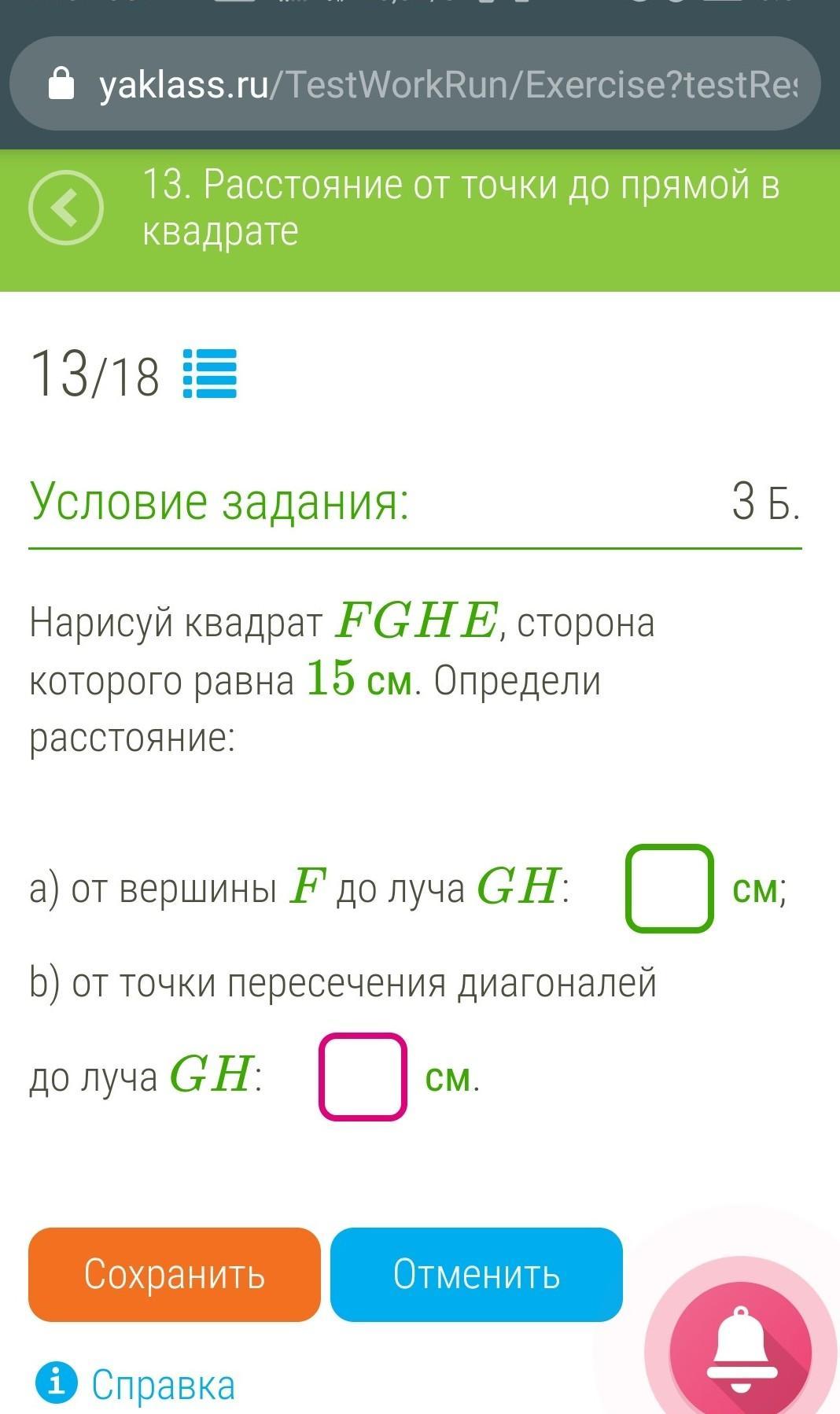 б)Диагонали пересекаюся в центре квадрата FGHE, а значит, что расстояние от точки пересечения диагоналей FH и GE до луча GH будет равно 7,5 (15:2=7,5).
