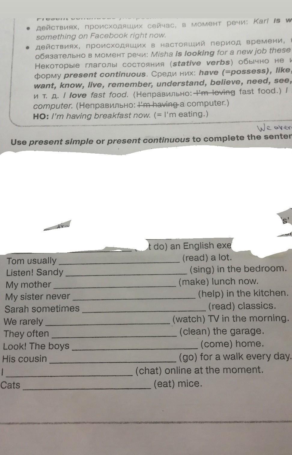 reads, is singing, is making, helps, reads, watch, clean, are coming, goes, am chatting, eat.