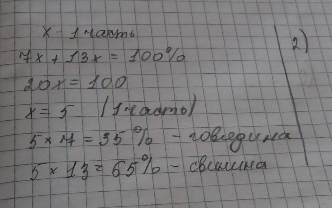 Решите пожалуйста и ещё это: для приготовления фарша взяли говядину и свинину в отношении 7:13 какой процент в фарше составляет говядина?