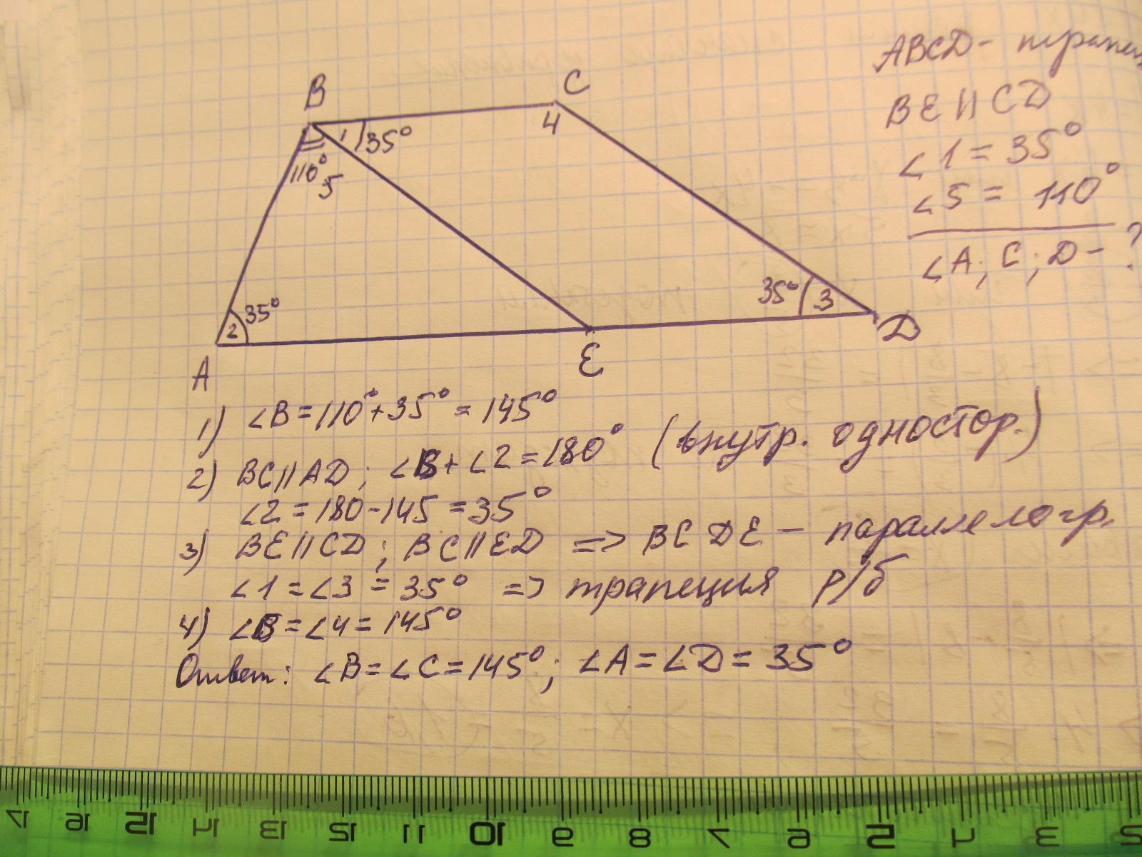 Дано:ABCD -трапеция , BC- меньшее основание , E принадлежит AD, BE параллельно CD Угол CBE =35 градусов Угол ABE =110 градусов.