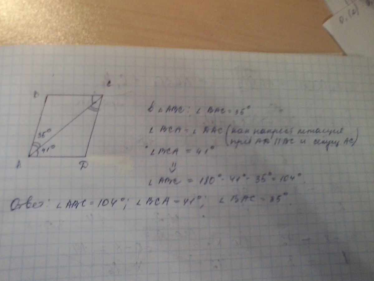 Диагональ AC параллелограмма ABCD образует с его сторонами AB и AD углы равные 35 градусов и 41 градус найдите углы треугольника ABC