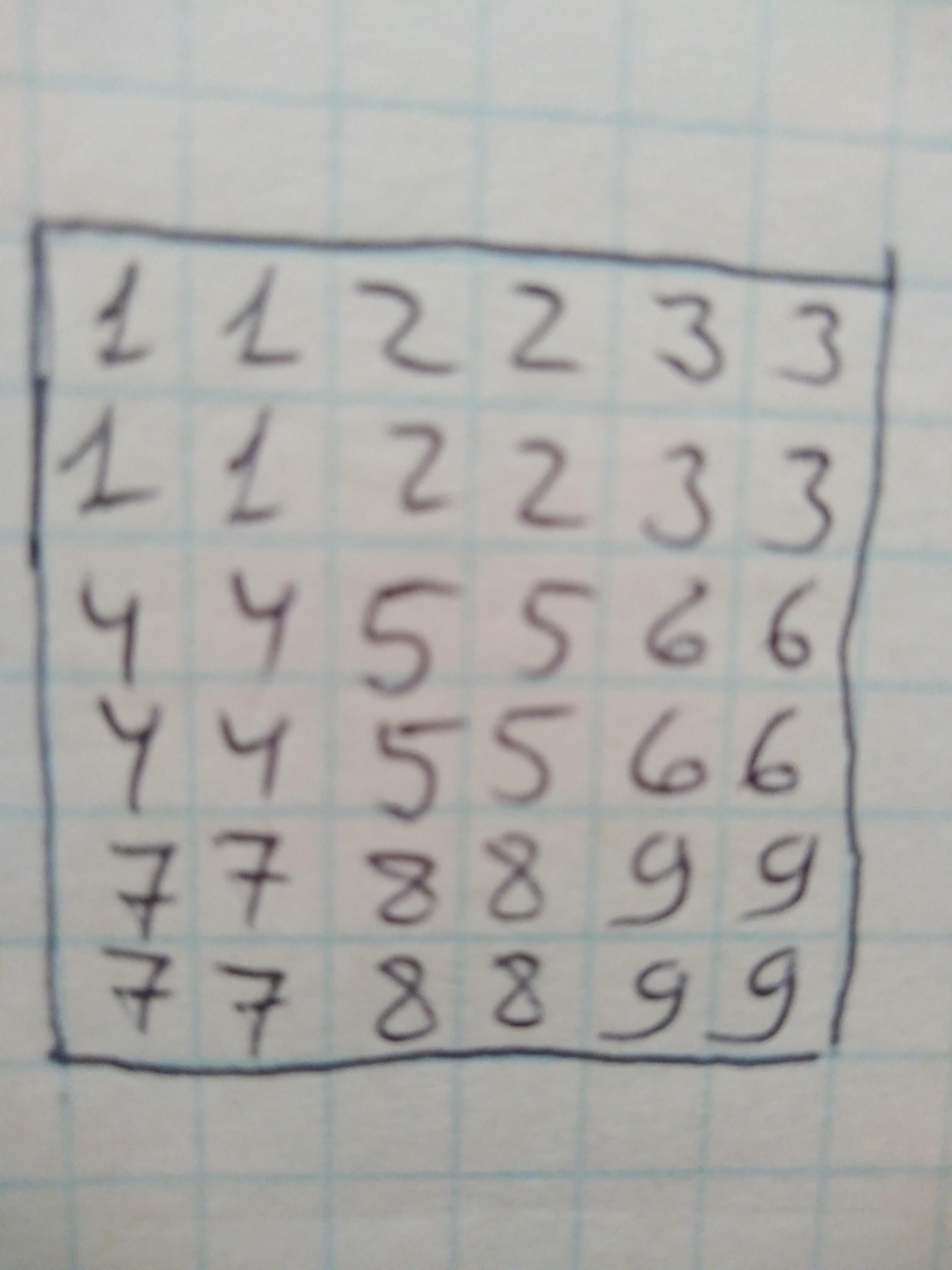 Задача 5. Петя расставил в клетки таблицы 6 × 6 разноцветные фишки так, что в каждой клетке находится ровно одна фишка, и рядом с каждой фишкой есть хотя бы две фишки того же цвета. (Считается, что две фишки находятся рядом, если они расположены в соседних по стороне клетках). Какое наиболь- шее количество разноцветных фишек могло быть использовано? (Приведите пример расстановки фишек и докажите, что больше цветов быть не может.)