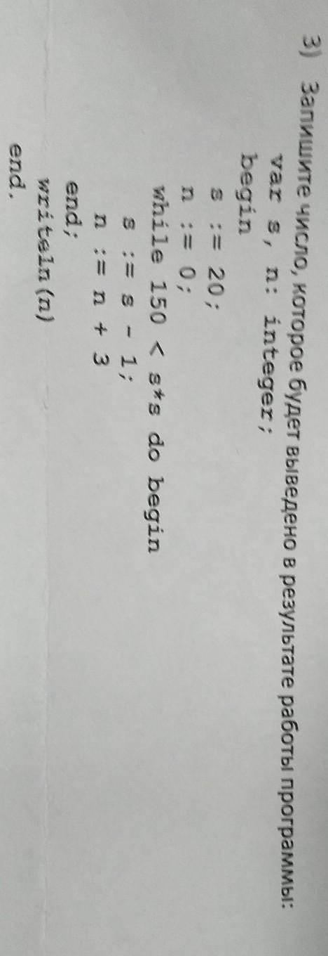 Цикл не выполнится ни разу, так как 150 < s*s ложно (s = 20) поэтому будет выведено исходное значение n=0