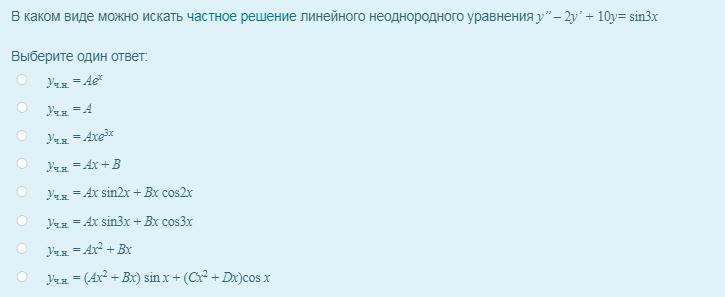 В каком виде можно искать частное решение линейного неоднородного уравнения y’’ – 2y’ + 10y= sin3x