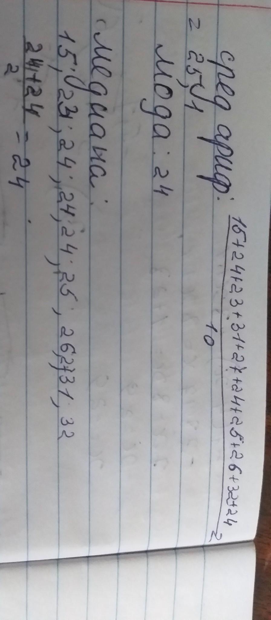 Рассмотрите ряд чисел: 15, 24,23, 31, 27,24, 25, 26,32,24. Найдите моду, размах, медиану и среднее арифметическое данного ряда.