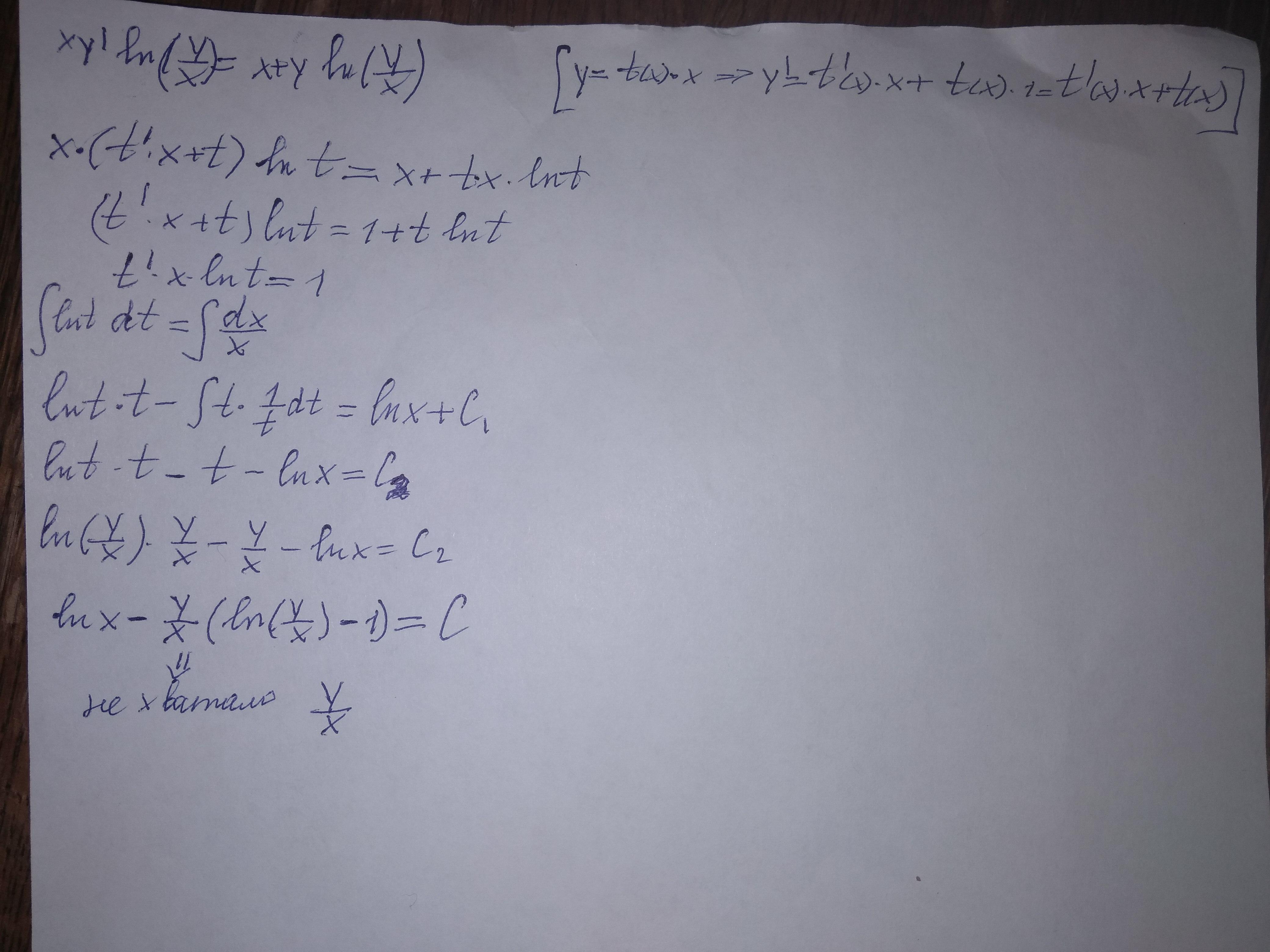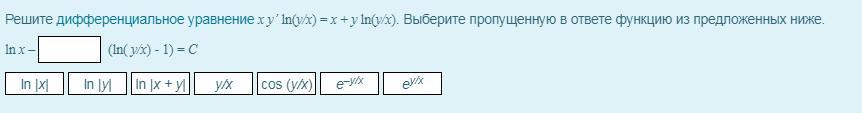 Решите дифференциальное уравнение x y’ ln(y/x) = x + y ln(y/x). Выберите пропущенную в ответе функцию из предложенных ниже.