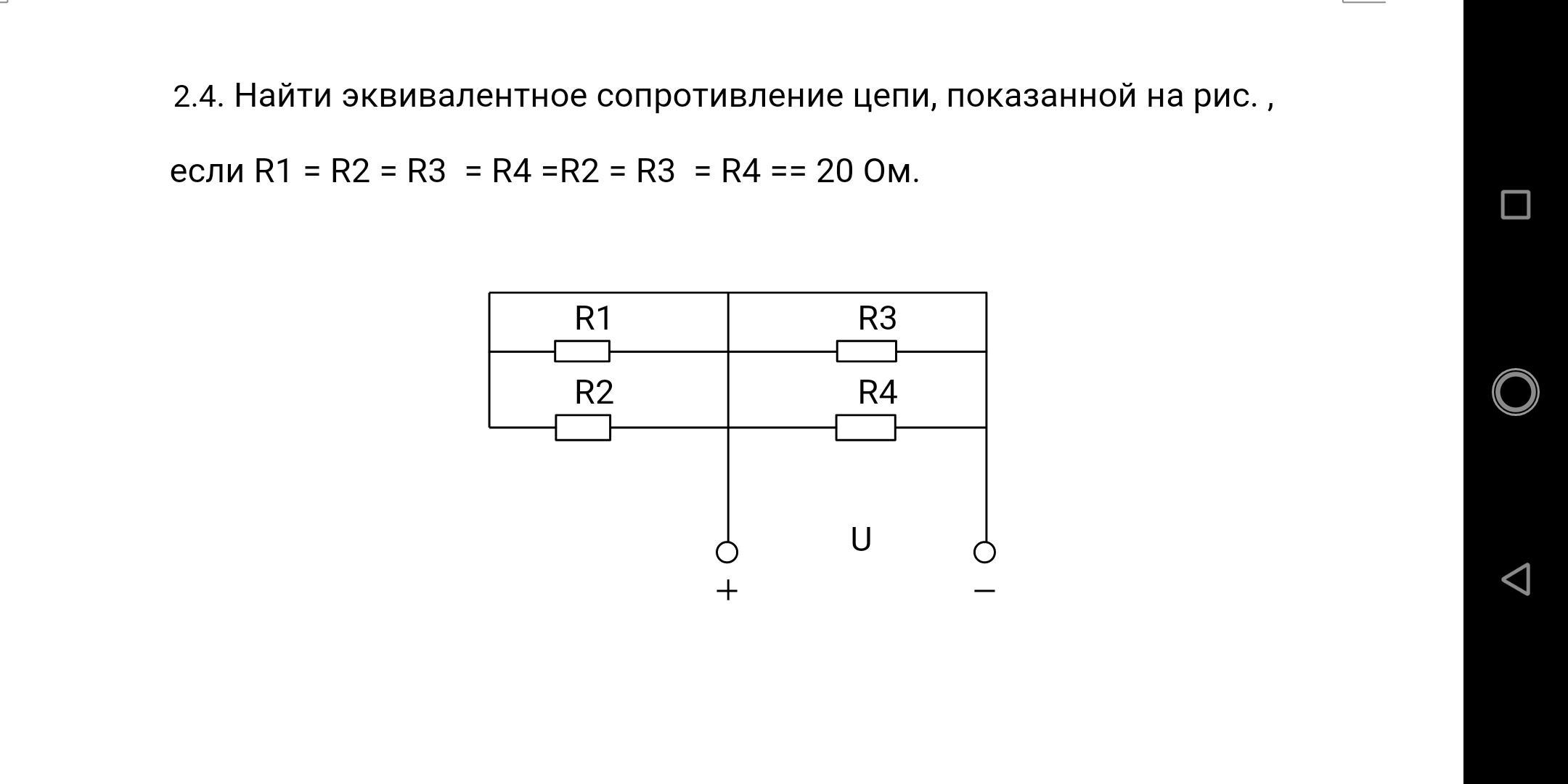 Все 4 резистора соединены по схеме параллельно!, а поскольку они равны, то Rпар=20/4 Ом=5 Ом= Rэкв