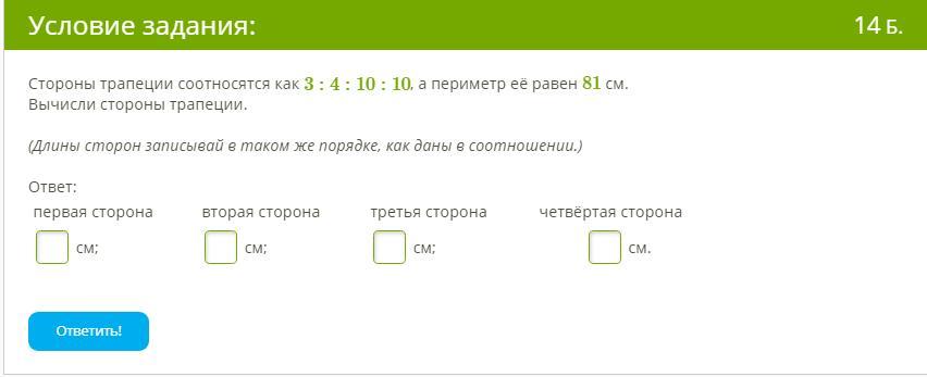 4) Обозначим коэффициент пропорциональности через k , тогда длины сторон трапеции равны 3k , 4k , 10k , 10k . Периметр трапеции- это сумма длин всех сторон. Составим и решим уравнение :