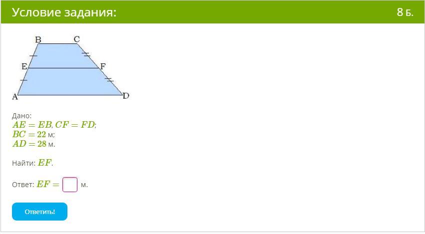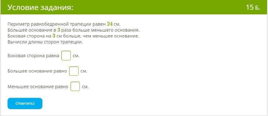 5)Обозначим меньшее основание трапеции через x , тогда большее основание равно 3x , а боковые стороны равны каждая по (x + 3) . По условию периметр трапеции равен 24 см. Составим и решим уравнение .