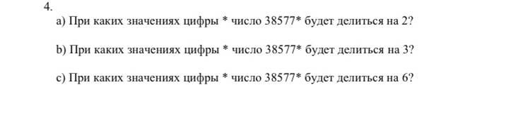 3)число 38577* будет делиться на 6 только в том случае, если оно будет делиться на 2 и на 3 одновременно(только 6)