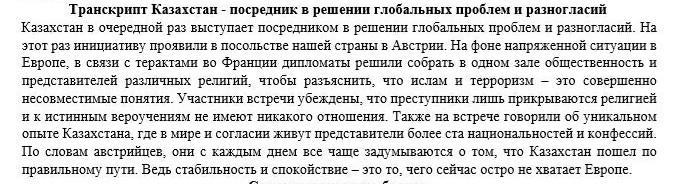 Ну в этом тексте говорится о том, как Казахстан правильно поступает имея более ста национальностей и конфессий.