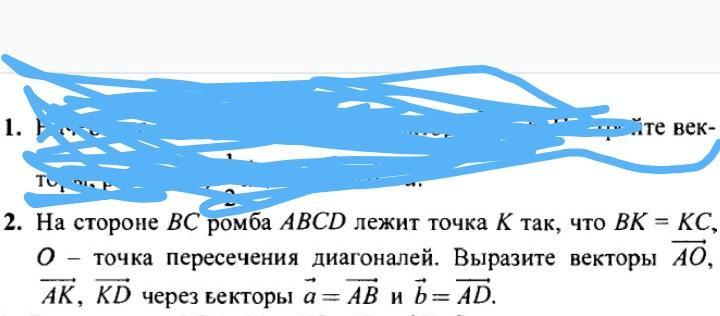 на стороне BC ромба ABCD лежит Точка K Так что BK равно KC о точка пересечения диагоналей выразите векторы АО АК KD через векторы a=AB b=AD