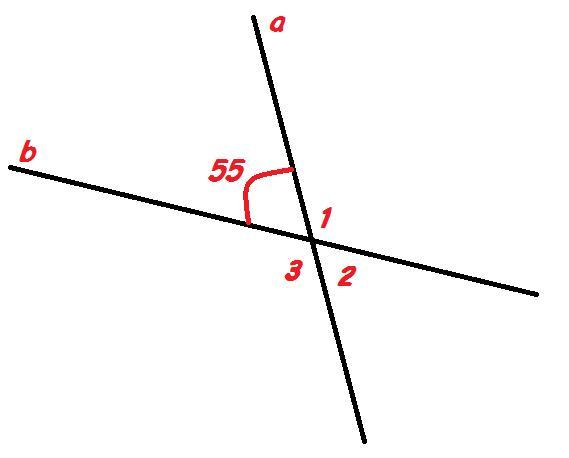Один из углов, образовавшихся при пересечении прямых a и b, равен 55 градусов. Найдите и запишите величины углов, обозначенных цифрами.