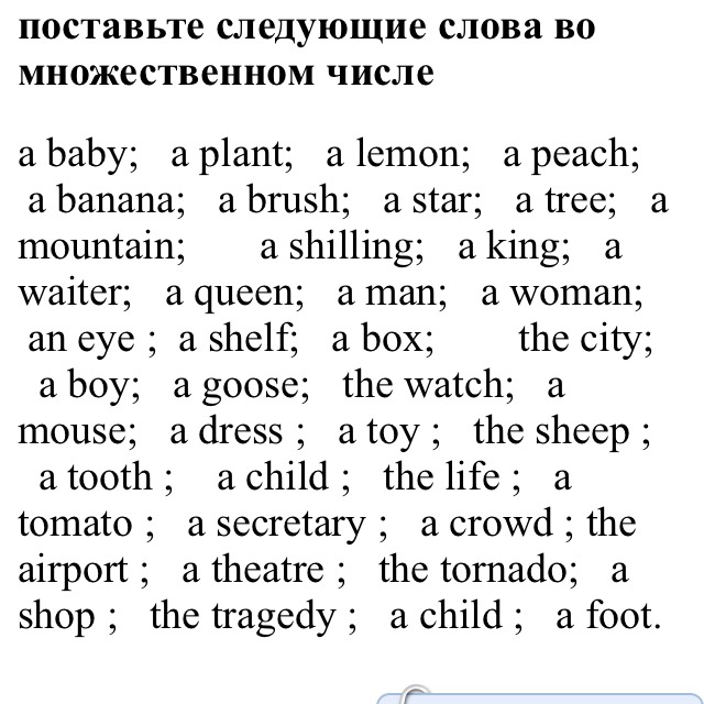 babies,plants,lemons,peaches,bananas,brushes,stars,trees,mountains,shillings,kings,waiters,queens,men,women,eyes,shelves,boxes,cities,boys,geese,watches,mice,dresses,toys,sheep,teeth,children,lives,tomatoes,secretaries,crowds,airports,theatres,tornadoes,shops,tragedies,children,feet