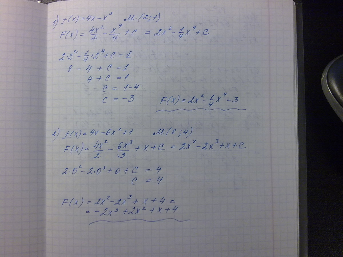 Найти первообразную для функции f(x)=4x-x^3 , проходящую через точку М(2;1), H(-2:3)