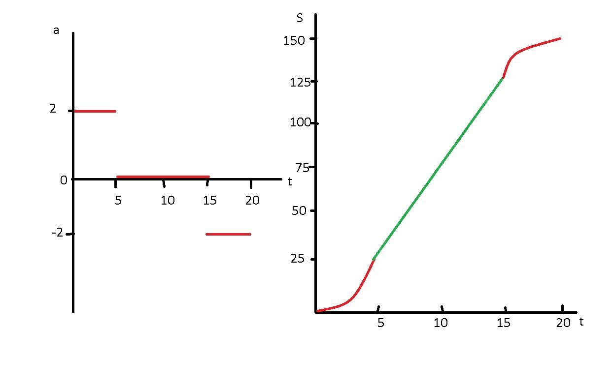 Путь по формуле s=(v+vo)*t/2 на первом и последнем