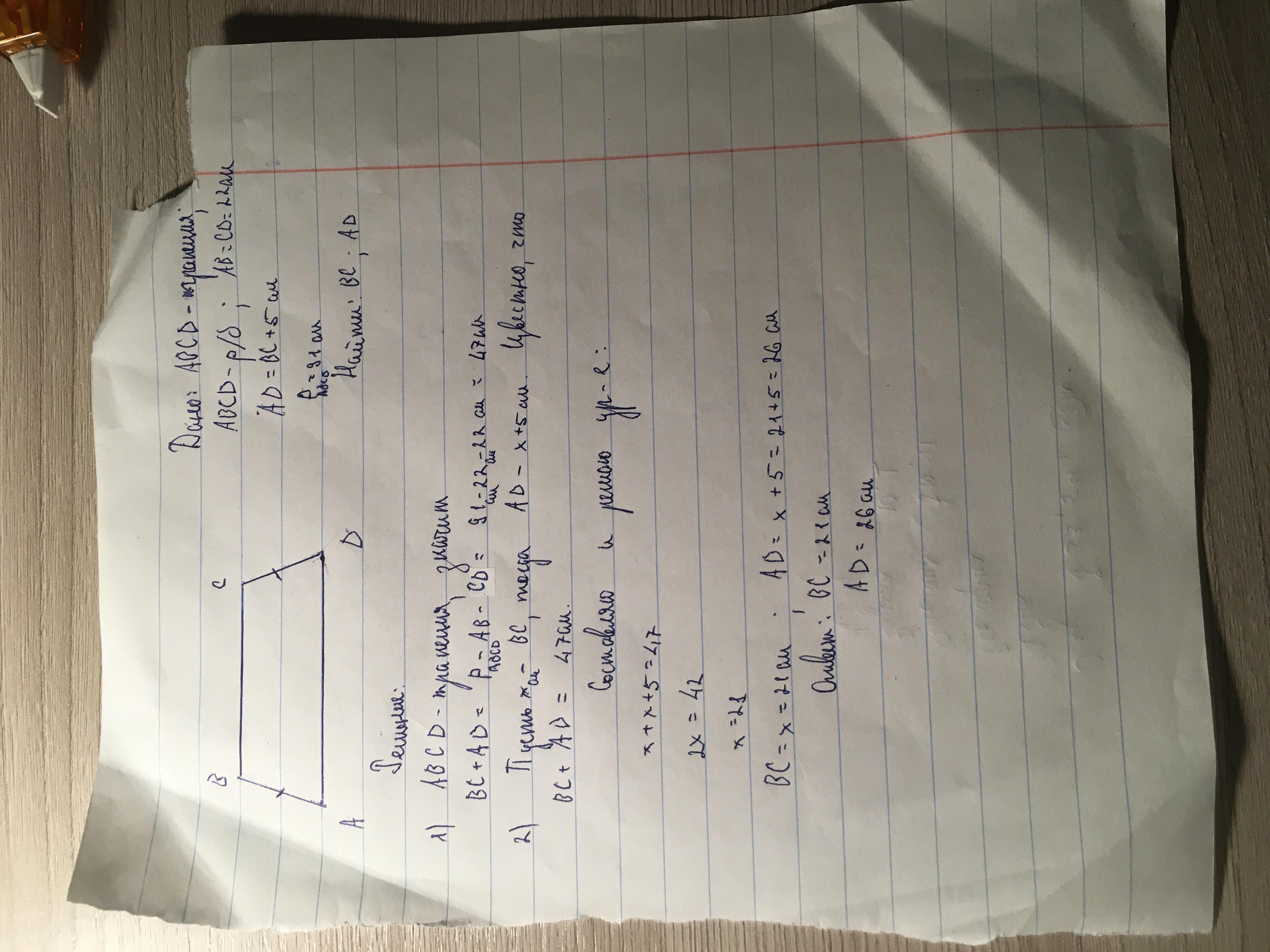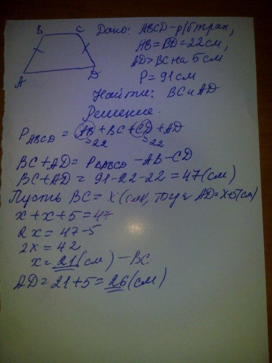 2.В равнобедренной трапеции боковая сторона равна 22см. Одно основание на 5см больше другого, а периметр равен 91см. Найдите основания трапеции.