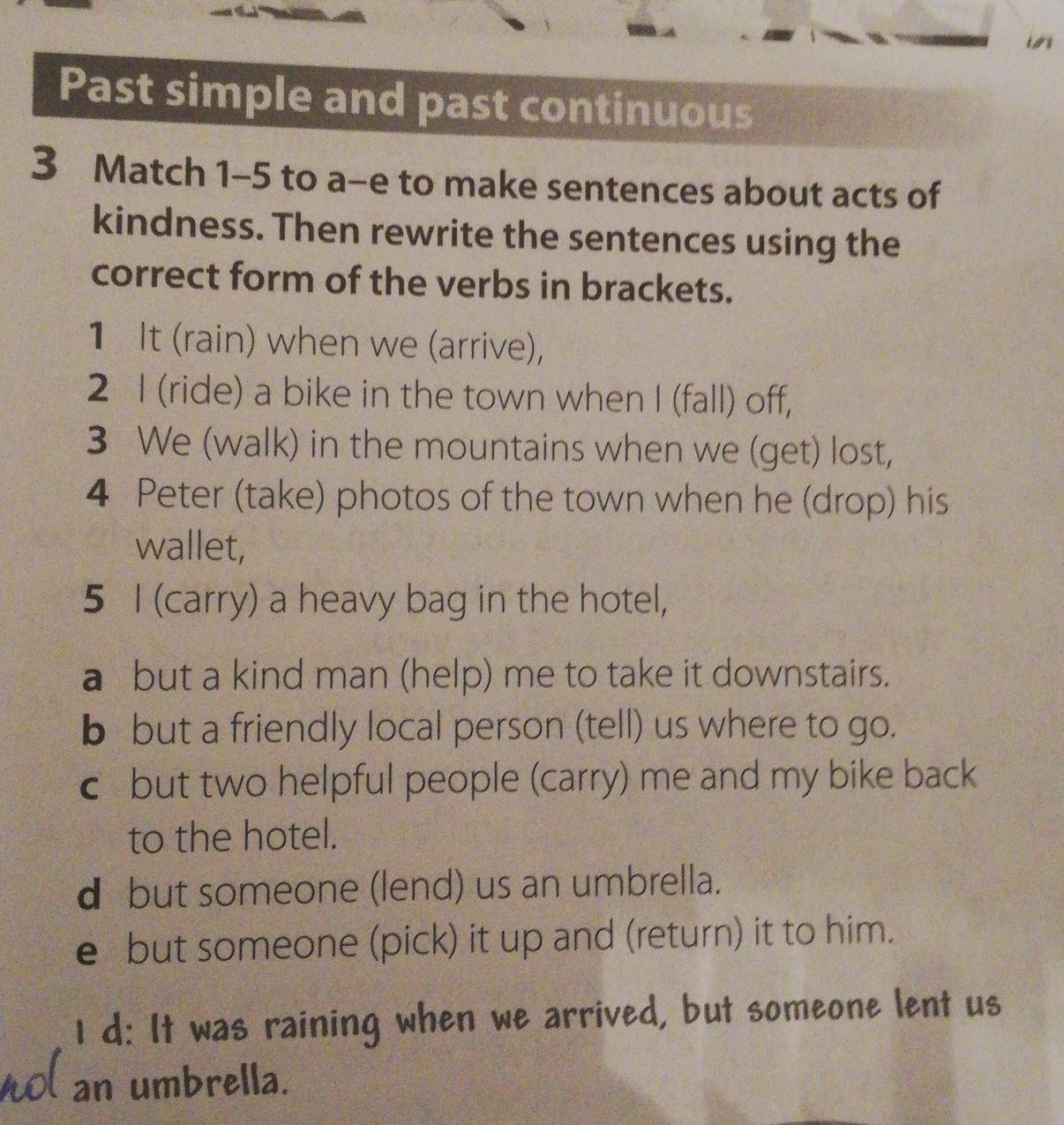 1. It was raining when we arrived, but someone lend us an umbrella.