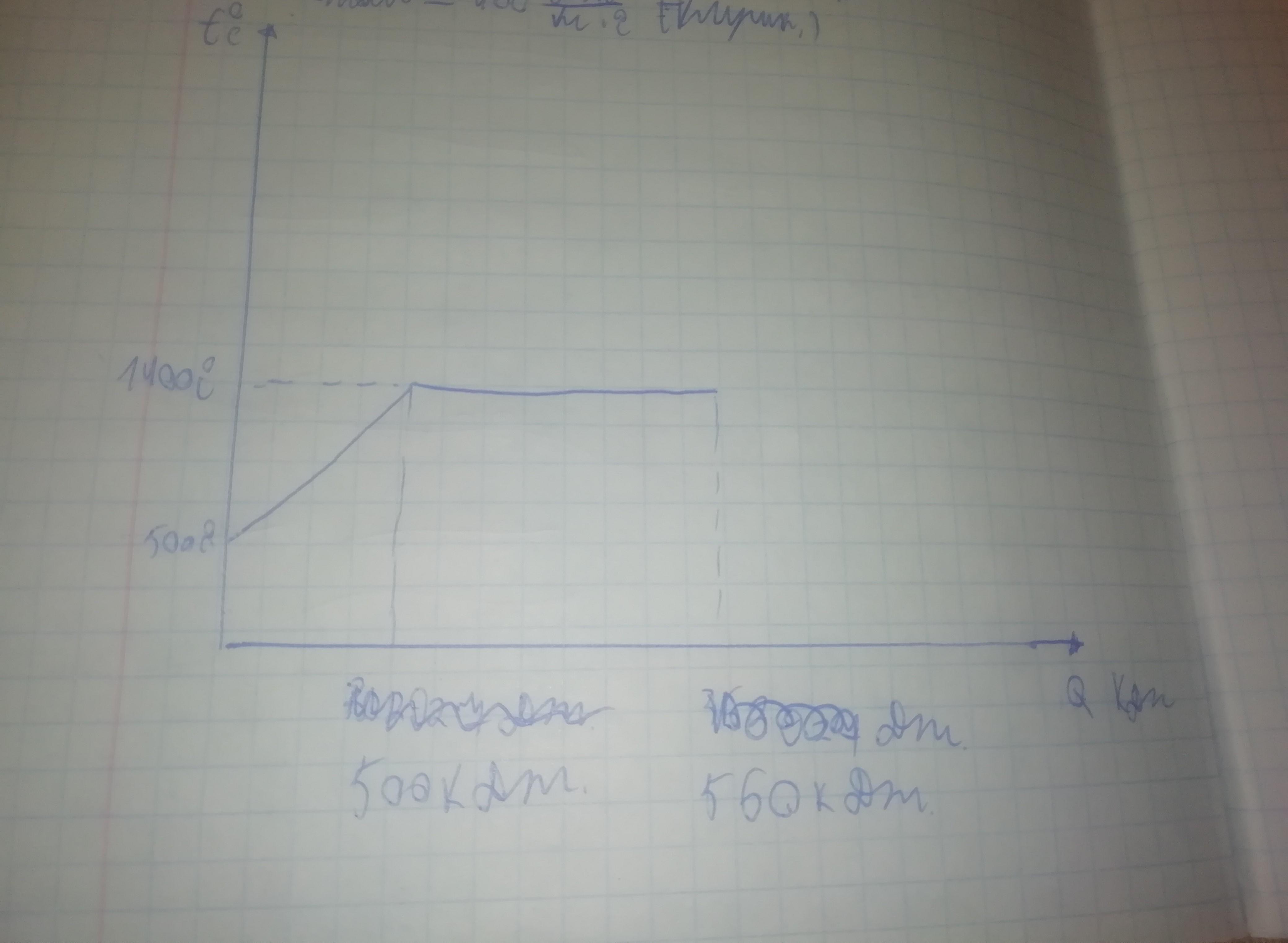 Построить график нагревания и плавления стали в координатных осях t от Q, если на нагрев стали от 500o C до температуры плавления израсходовано 500 кДж теплоты, а на плавление - 60 кДж теплоты.