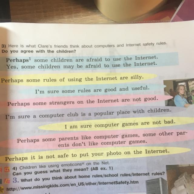 Пожалуй, некоторые дети боятся(?) юзать инет. Да, некоторые дети могут бояться юзать инет. Возможно, некоторые правила юзанья инета неразумны(глупы). Я уверена, что некие правила хороши и полезны. Может быть, некоторые персоны из инета не являются хорошими людьми. Я уверена, что компьютерный клуб является популярным местом с детьми. Я уверена, что комп. игры не являются плохими. Возможно некоторым родителям нрав ком. игры, а другим они не нрав. Возможно, это не безопасно выкладывать своё фото в инет.