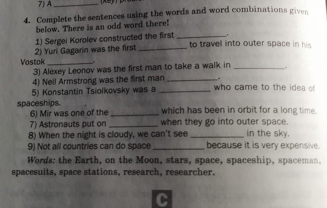 1.spaceship 2.spaceman, spaceship 3.space 4.on the Moon 5.researcher 6.space stations 7.spacesuits 8.stars 9.research