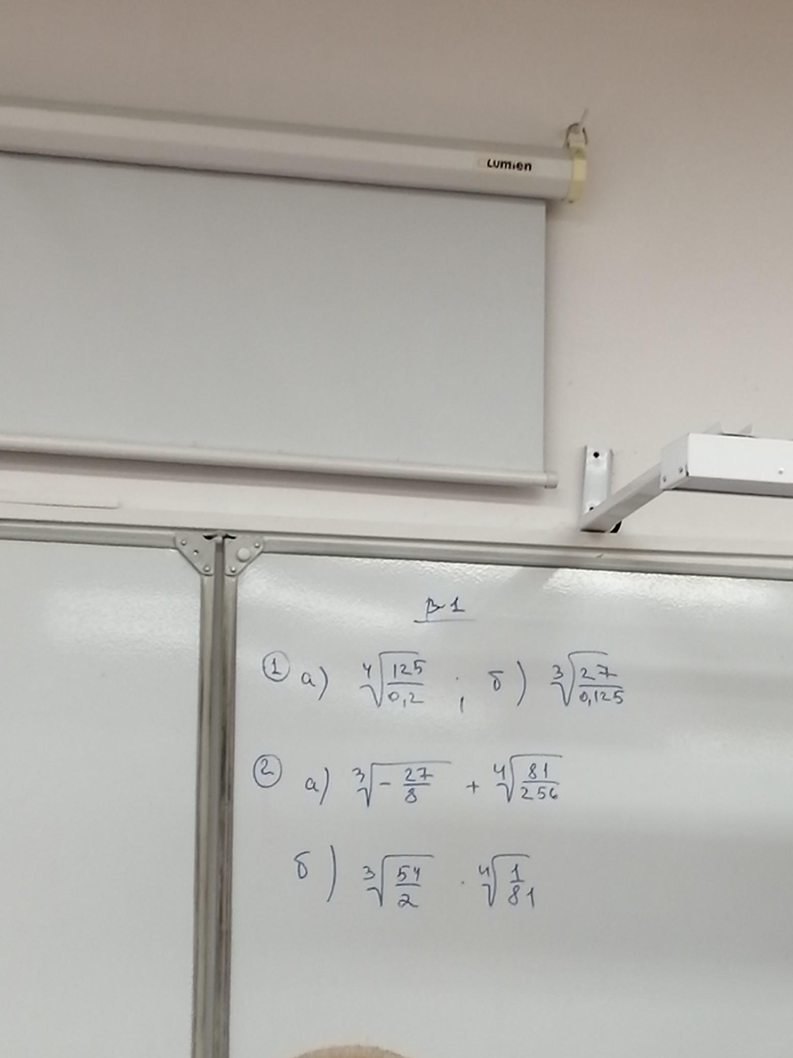 б) ∛(54/2)*⁴√(1/81)=∛27*⁴√(1/3)⁴=∛3³*(1/3)=3*(1/3)=1.