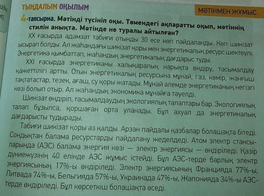 Задача 4. Понять смысл текста. Прочитайте текст ниже и определите математический стиль. Что говорит текст? В двадцатом веке люди использовали около 30 натуральных жиров. Шина была потрачена впустую. А сырьевые и энергетические ресурсы в мире ограничены. Энергия выросла, и произошел глобальный энергетический кризис. XXI Faith увеличила потребность в производстве и транспортировке энергии на международном рынке. Топливно-энергетические ресурсы включают нефть, газ, сланцы, легковоспламеняющиеся бассейны, навоз, древесину, водохранилище. Нефть является основным источником энергии в мире. Мировая экономика зависит от нефти. Вводить сырье, иметь транспортные требования. Экологические нарушения продолжатся. Эта ситуация также вызывает энергетический кризис. Натуральное сырье короткое. Дешевые минералы закончатся в будущем. Поэтому использование альтернативных ресурсов ускорилось. На атомных электростанциях (АЭС) альтернативные источники энергии генерируются электричеством. В настоящее время АЭС работают в 40 странах мира. На этих АЭС будет введено 17% всей электрической энергии. 77% электроэнергии во Франции, 74% в Литве, 57% в Бельгии, 47% в Украине и 34% в Японии производится на АЭС. Эта цифра в будущем.