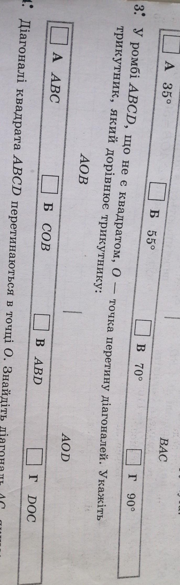 в ромбе АВСD точка О явл пересечением диагоналей. укажите треугольник который равняется треугольнику. 1) AOB 2)AOD