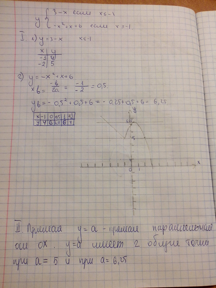 Постройте график функции: y={3-x, если x<͇-1, -x^2+x+6, если x>-1